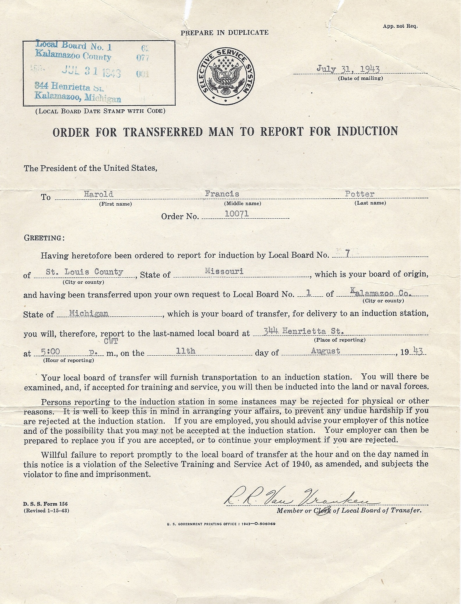 People were more concerned with “our problems” than those across the sea. We were more interested in getting rain for our farm crops and gardens, getting food put away for the coming winter and trying to pay our taxes. Then in 1939 and early 1940 our area started seeing the affects of the “far away” war. Our country started supplying England, Russia and other allies with all kinds of war-making equipment; planes, guns, trucks, ammunition, food, clothing and more. Because of this, many factories started running around the clock filling “war orders.” Jobs started being available. When the war became “ours” in 1941, I was three years out of high school, had completed a welding course and was working in a steel factory in Kalamazoo, Michigan doing “war essential” work. I had registered for the draft, but because of my work was given a “deferred” status. I might have been able to stay the war right there since I was deferred, was married and doing “war essential” work. But I knew I did not want to spend my life doing that work, and with so many my age either volunteering or being called up, I didn’t feel I was doing my “full share” by staying. The Army Air Corps was vigorously recruiting young men to fly the airplanes our factories were beginning to build. I had taken a couple short airplane rides, enjoyed them and thought this was a way I could make a useful contribution to the war effort. It was also a profession I could follow after the war, if I were to be lucky. When the Army Air Corps opened up the flying cadet program to “married’s”, with my wife’s blessing, I waived my draft exemption and signed up. We both felt we should do our “fair share” and I knew I wanted to fly. My wife June, had been working for the War Department at Ft. Custer, Michigan since 1941. A older friend was an instructor in the Navy’s preliminary flight training program, flying the J-3 piper cub. I told him of my plans. He suggested a flight to “see if you’re able to do it.” I enjoyed the flight and the instruction. He was impressed enough to say “go for it”, so I petitioned the draft board for immediate induction and received my call-up in mid 1943.